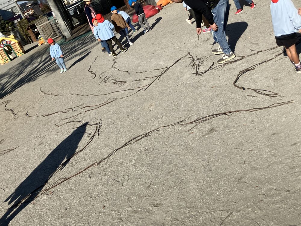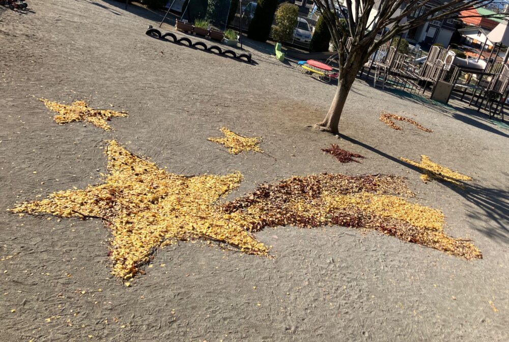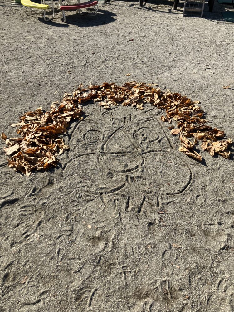 講師の先生と一緒に枝や葉を使ってお絵描きをし、出来上がりを2階のベランダから見てみると「ママにも見せたいな~」なんて言う声も聞こえてきました。