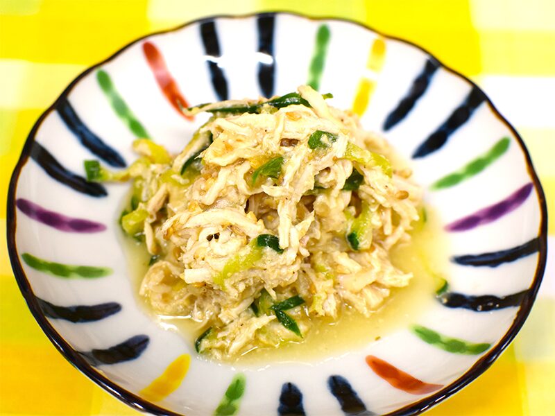 ②①の鶏肉のあら熱がとれたら、細く裂き、冷蔵庫で冷ましておく。